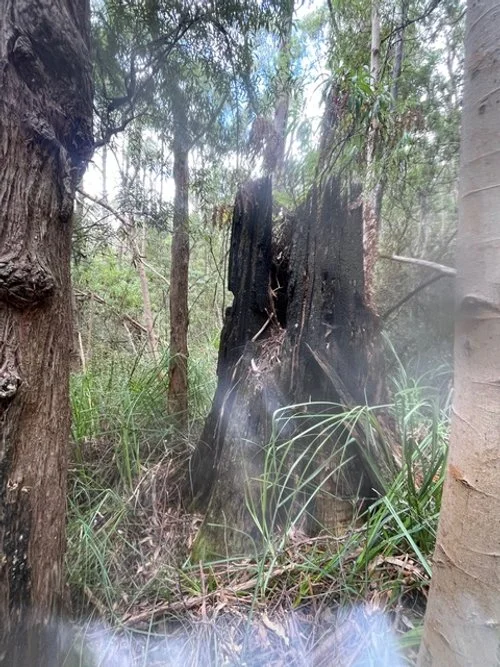 Within twenty years—likely much less—the best of the old growth had been cut from either side and slid away. In 1846 Sawmill was written off as an “old track”. It appears to have been little-used during the second half of the 19th century, and after the Cascades sawmill closed in the 1880s the track quietly began to disappear—except that it was rediscovered and lengthened, not by foresters, but by walkers, in order to reach Sphinx Rock. Then in 1909, it was extended from Sphinx Rock through subalpine E. coccifera forest to the Organ Pipes.